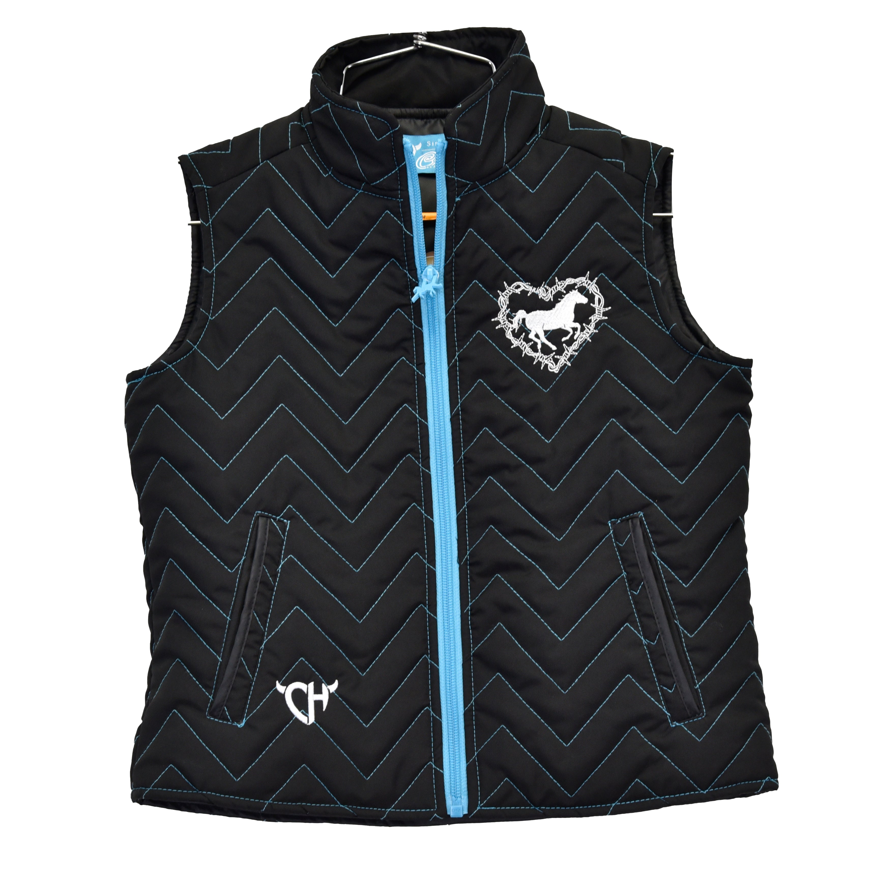 Wrap your little one in cozy charm with the CH Black "Country Angel" Quilted Vest from Cowboy Hardware. This stylish vest features a sleek black design accented with vibrant blue trim, making it perfect for any adventure.