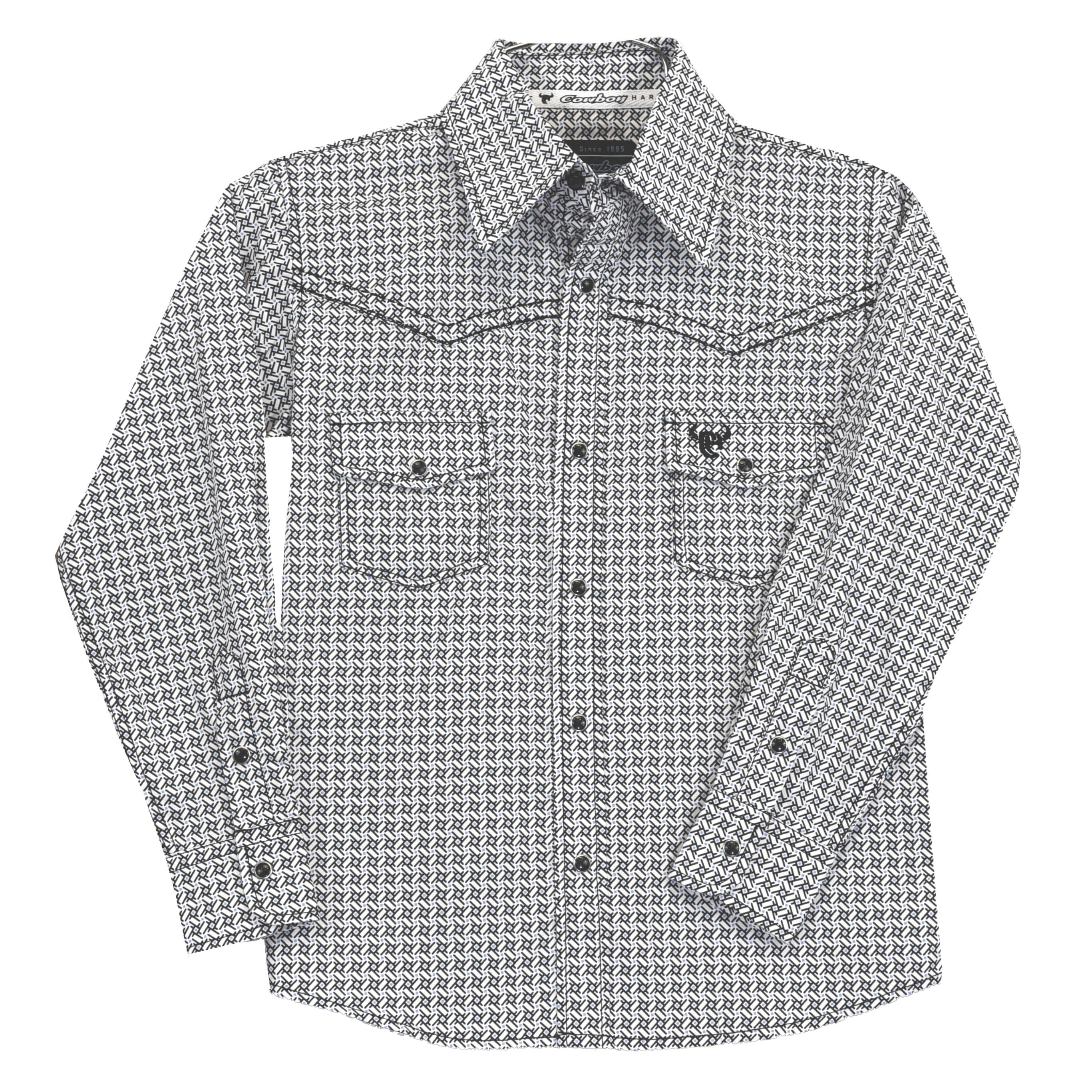 Crafted from a striking white and black patterned fabric, this shirt combines classic cowboy charm with modern flair, making it perfect for any young wrangler.