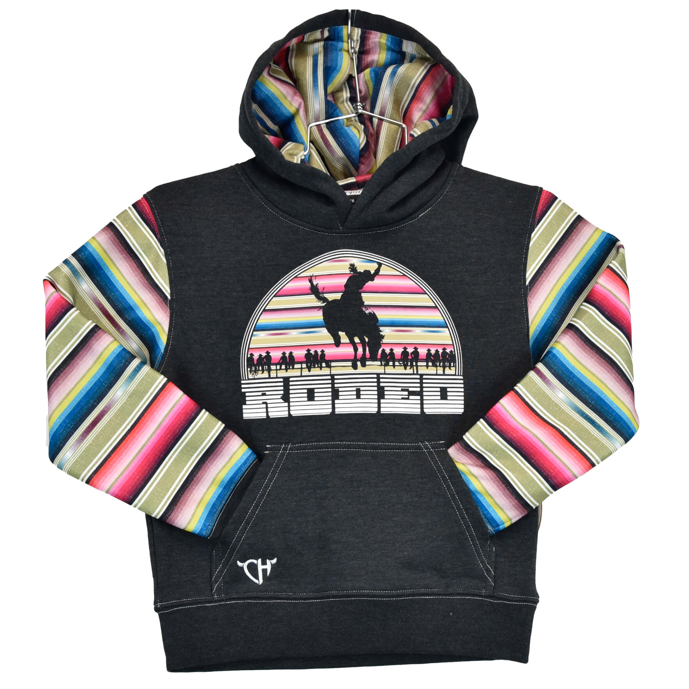 She'll stand out in true western style with this bold "Rodeo" fleece hoodie. The vibrant serape sleeves and hood add a pop of color against the sleek black body, while the rodeo silhouette graphic front and center gives it authentic cowgirl spirit. Made from soft, cozy fleece, it's perfect layering,