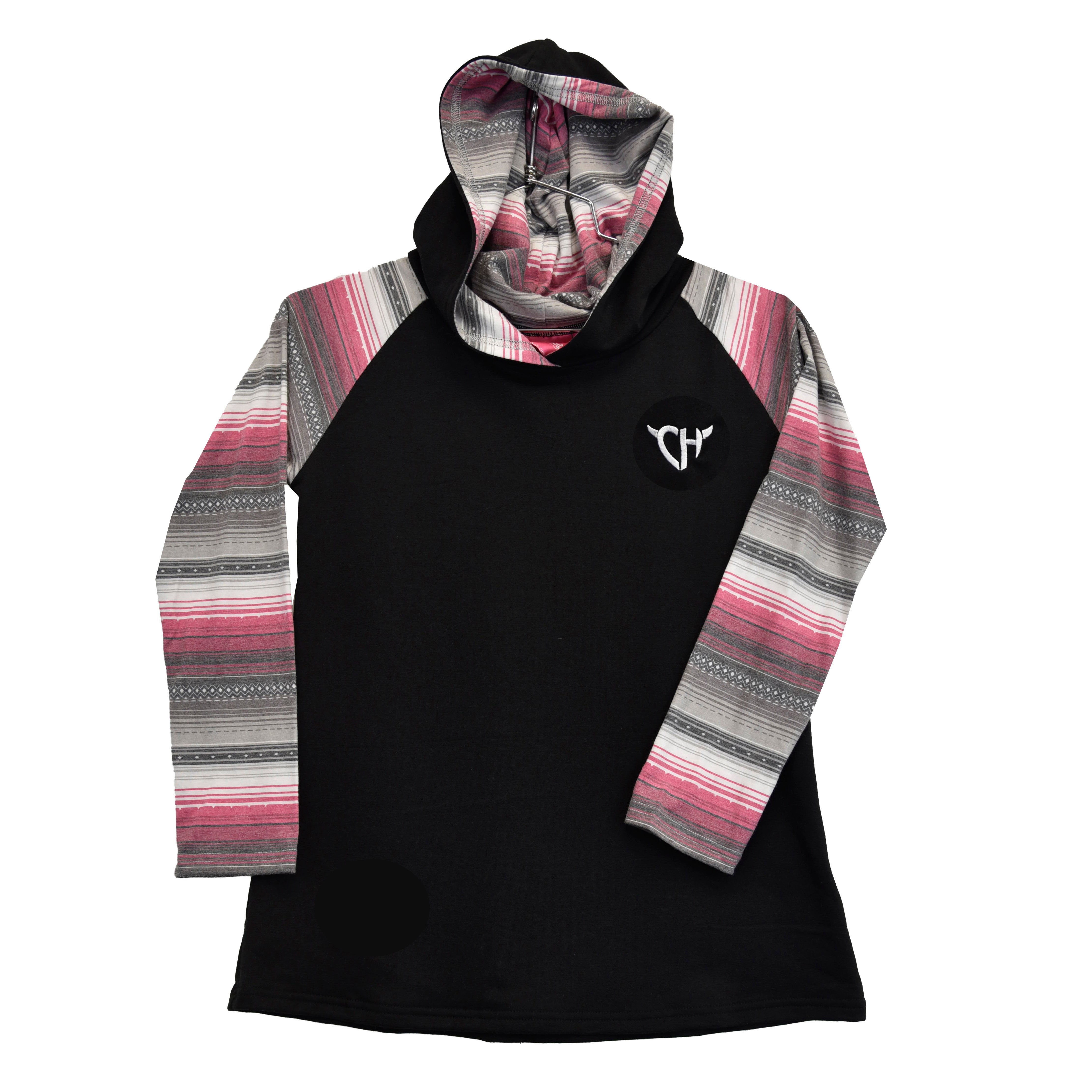 Embrace your inner cowgirl with our Women's CH "Serape-Aztec" Black Long Sleeve Hoodie. This stylish piece features a striking black and pink design, complete with a cozy hood and a vibrant pink stripe that adds a pop of color. Crafted for comfort and durability.