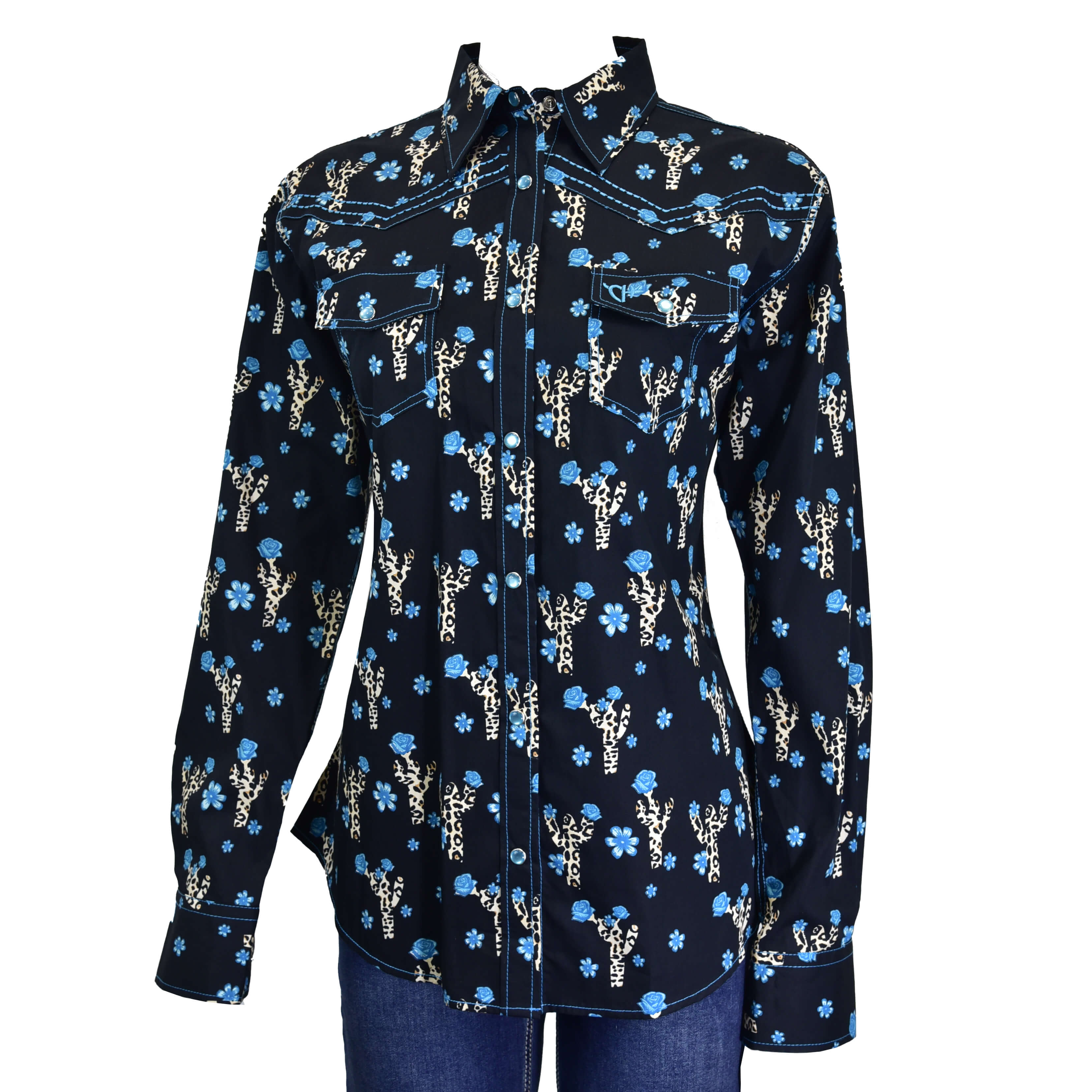 Stand out with bold desert style.  This shirt features a striking print of leopard patterned cacti and blue desert blooms against a black background.  Detailed with turquoise contrast stitching, pearl snaps and western yokes, it brings a fresh twist to a timeless silhouette.  It adds a wild western edge to any outfit-because ordinary just isn't your style.