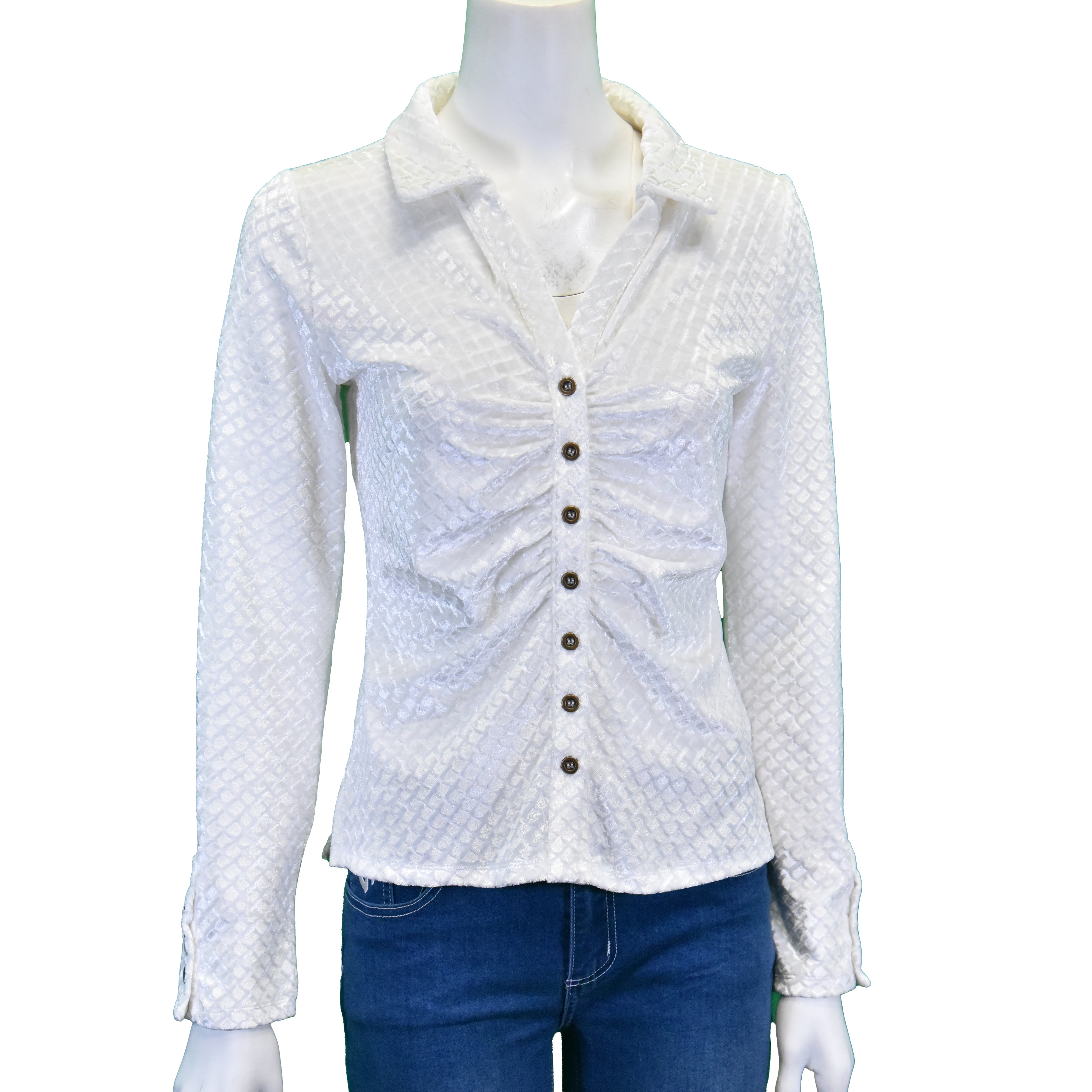 This charming white blouse features a classic button-up front and a flattering V-neck design, perfect for layering or wearing on its own. Crafted with a soft, velvet-like fabric, it offers both comfort and style, making it an ideal choice for any occasion, from a casual day out to a cozy evening in.