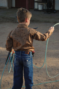 This western shirt features a brown base with an all-over print of black branding irons. Snap closures and classic western details make it a rugged and stylish choice for your little cowboy,